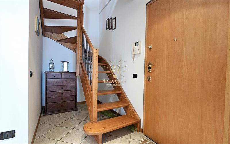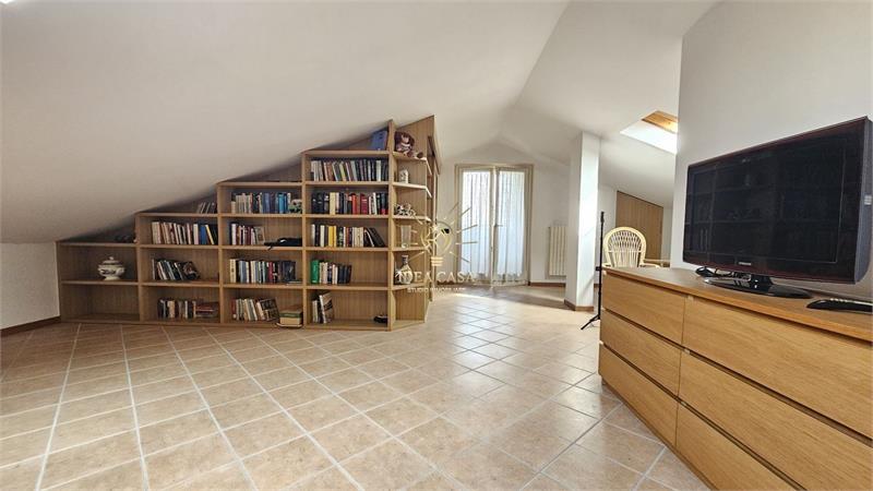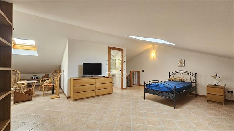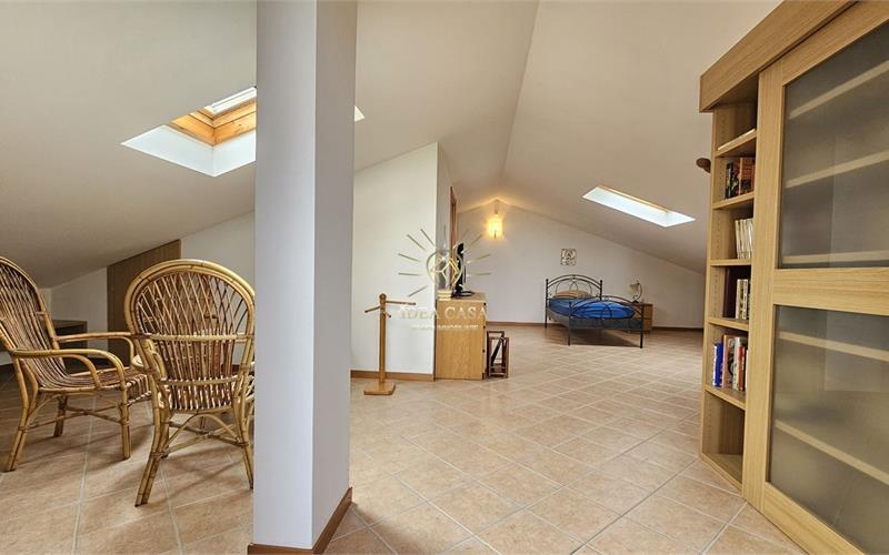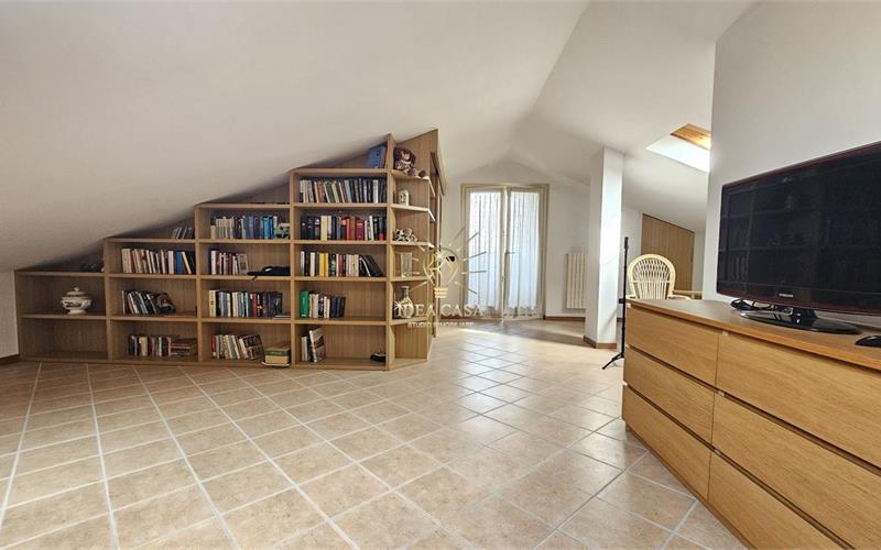 Attraverso una pregiata scala in legno massello si accede allo spettacolare sottotetto. Uno spazio versatile dotato di un ulteriore balcone loggiato, perfetto come locale hobby, area relax o ulteriore zona notte.